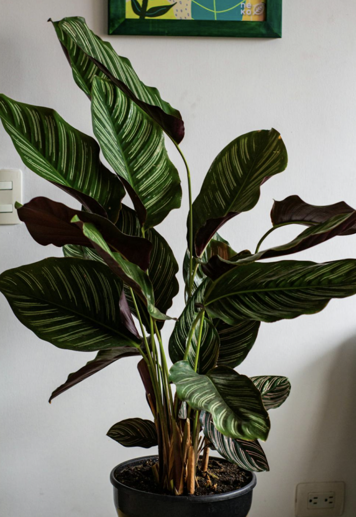 - Vochtigheid: De Calathea houdt van een hoge luchtvochtigheid, dus een regelmatig sproeien van de bladeren is aan te raden.